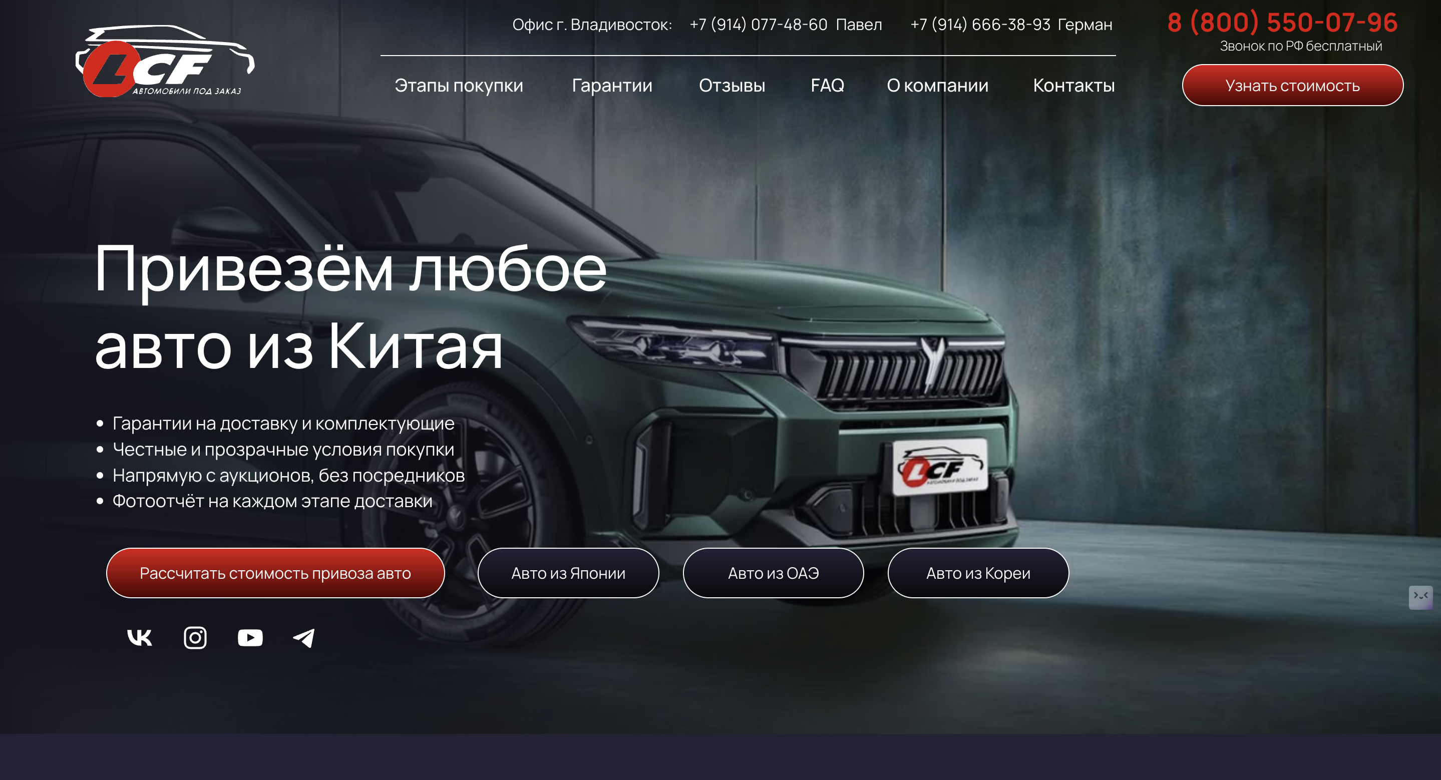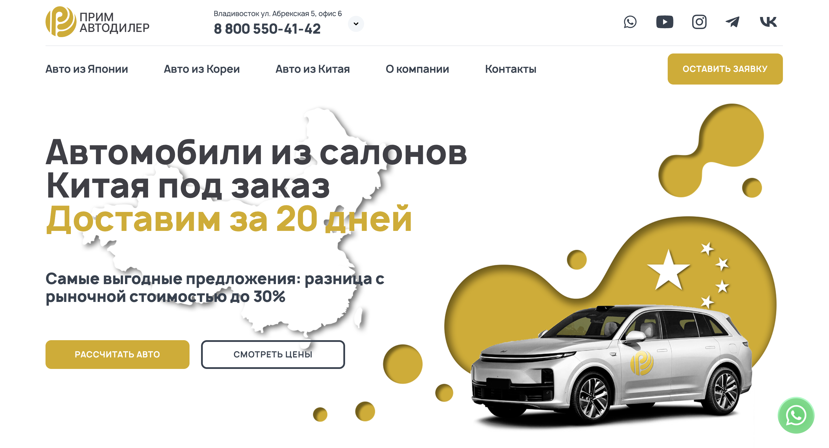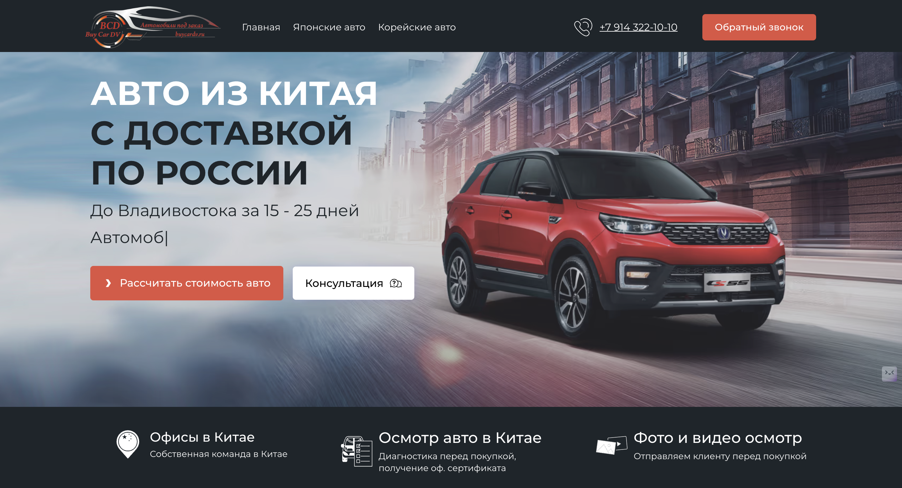 Компания существует на рынке порядка трёх лет и предлагает «под ключ» услуги по доставке автомобилей из Китая. Берут на себя все этапы — от поиска лота до передачи авто клиенту, включая таможню и логистику.